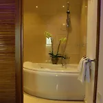Z pokojů je možnost shlížet dolů na vnitřní dvorek. K apartmánu patří také fén a sprcha v koupelně.